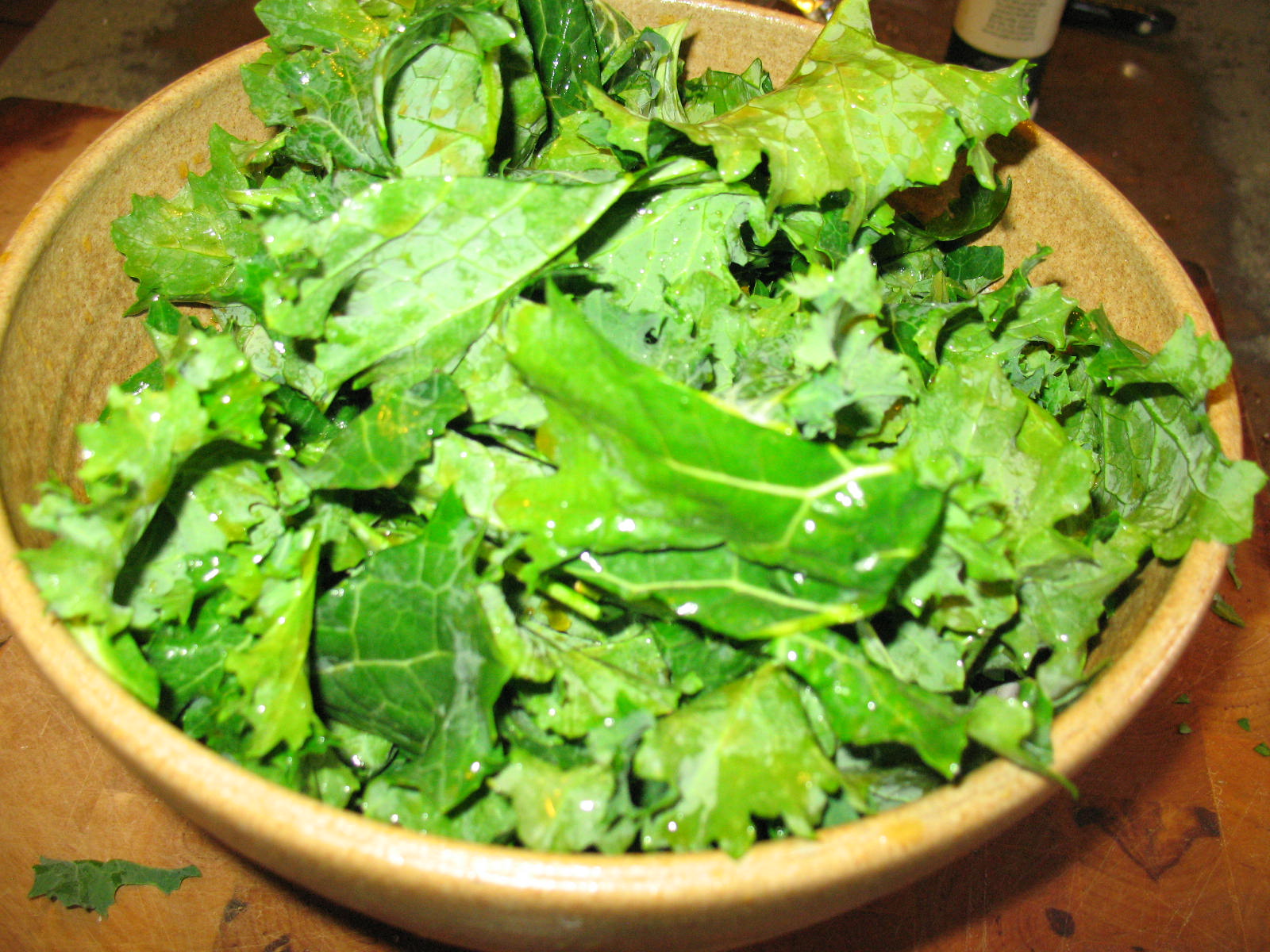 Pour this mixture into your bowl of kale, and then hand toss the kale until it is evenly coated with the mixture.
