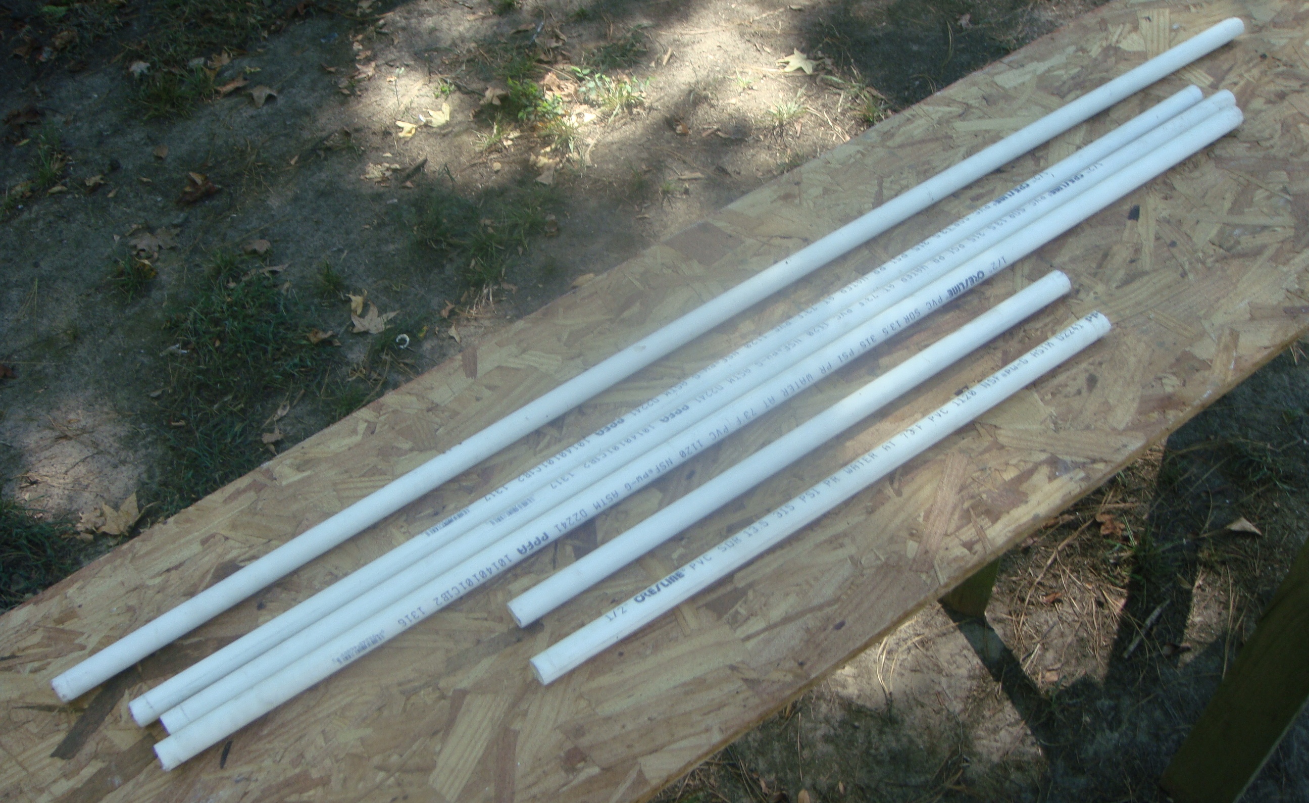First I cut my ½” PVC into lengths. Three pieces 44” long, two pieces 21 5/8” long, and one piece 51” long.