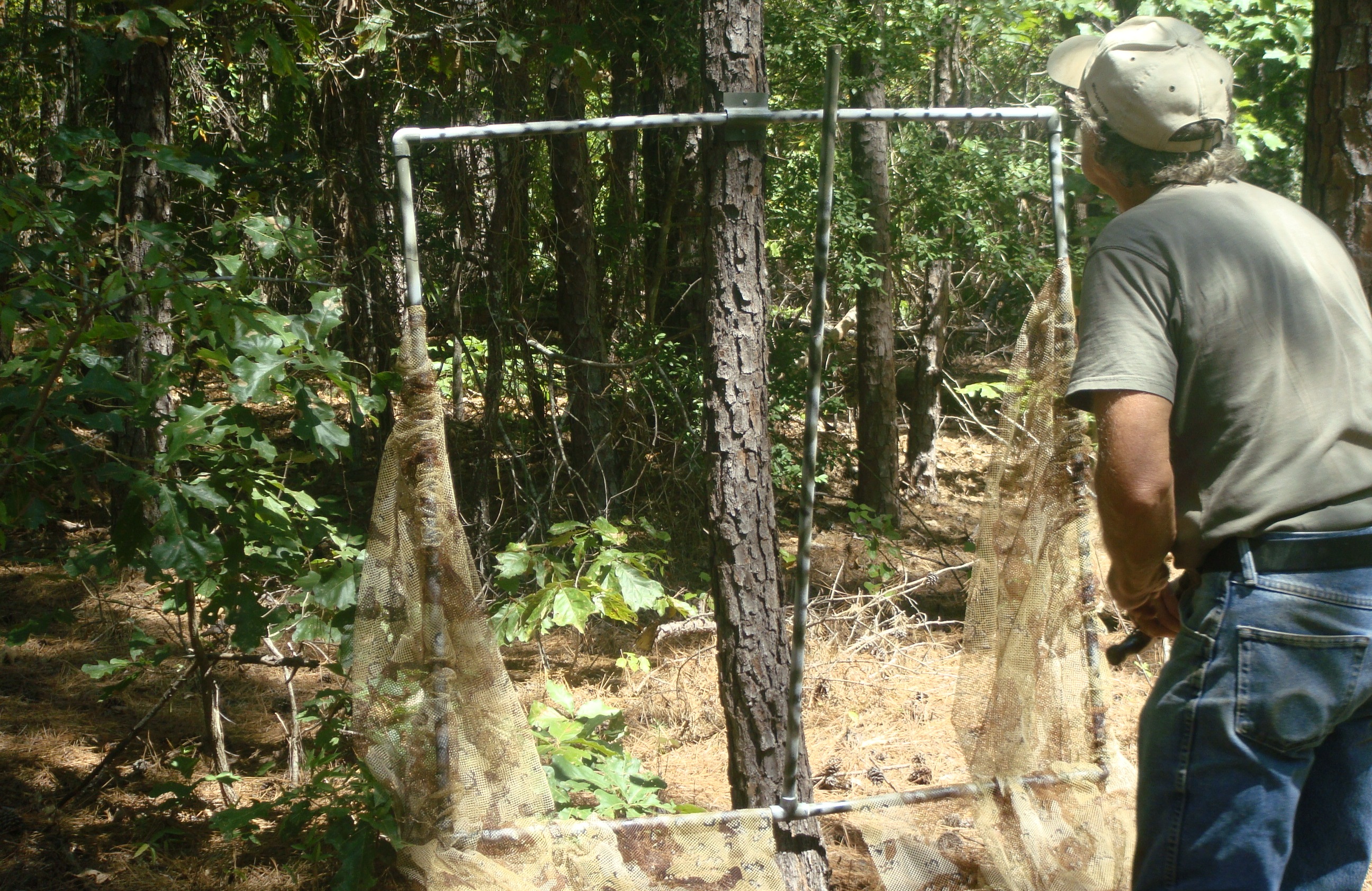 Okay, we’re ready for a little test assembly. I set the blind up on the ground to see if it would hold together the way I hoped. If everything is good, I will finish up the curtains and climb up into my deer stand for final assembly.