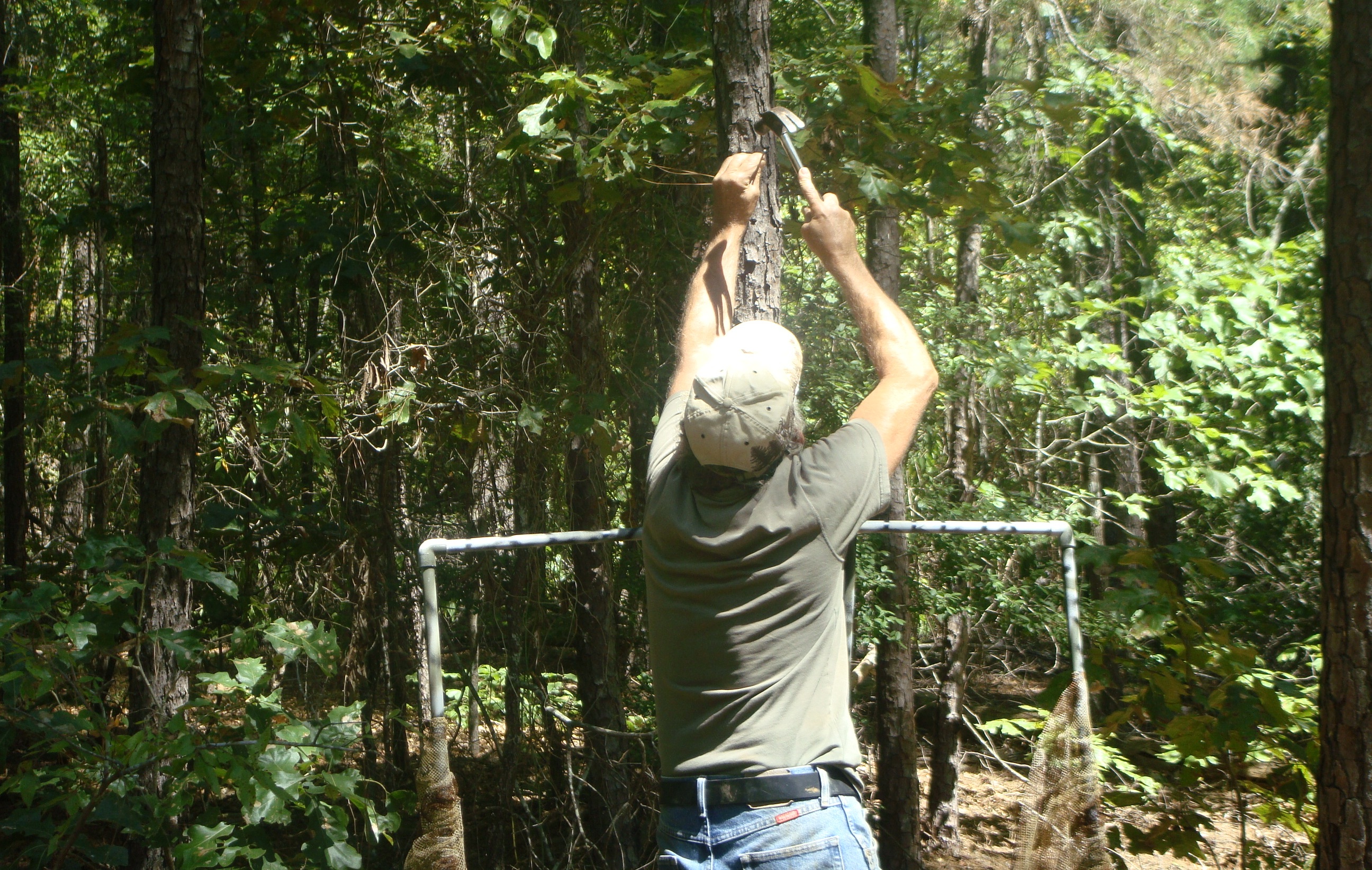 Now it’s a simple matter of snapping the framework together. What you end up with is a square with the “T” joint on the front and the 51” piece angling up at about 45 degrees. The angled piece will act as a brace that attaches the front of the frame to the tree.