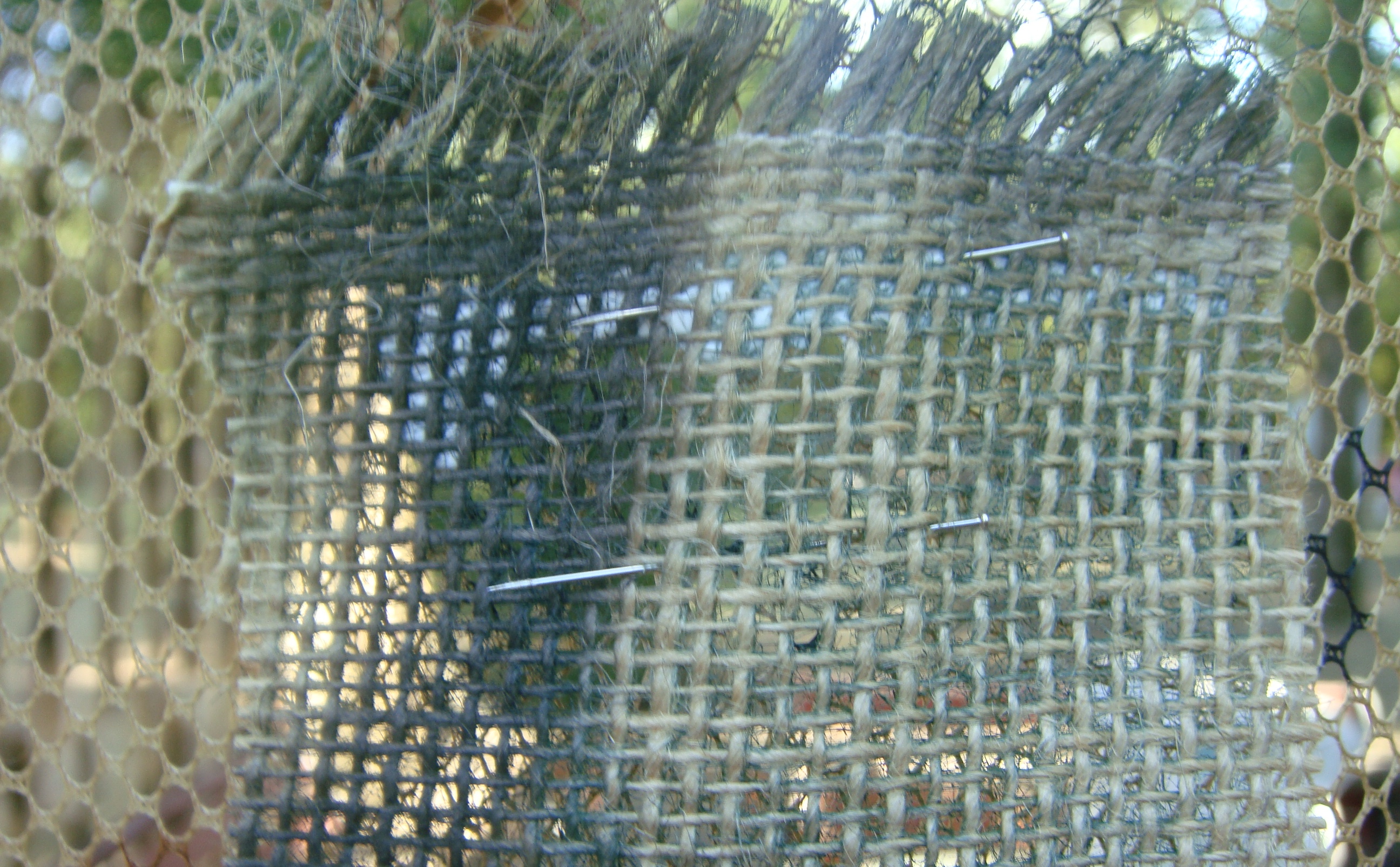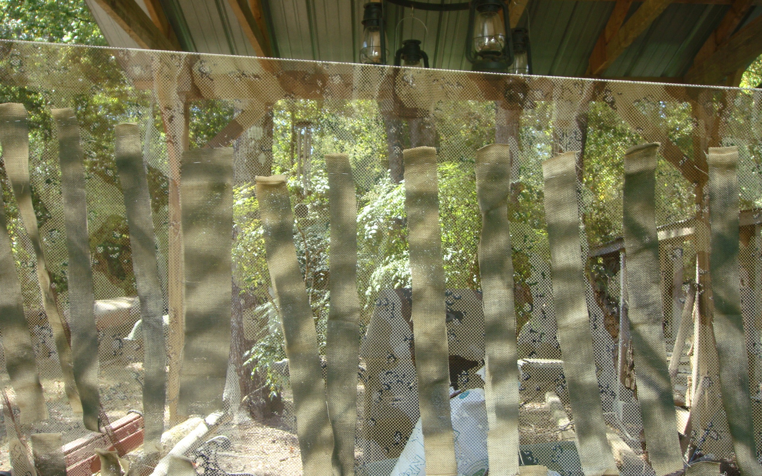 I hang my netting up on a rope and pin the burlap strips to the netting. I pin the strips about an inch below the top.