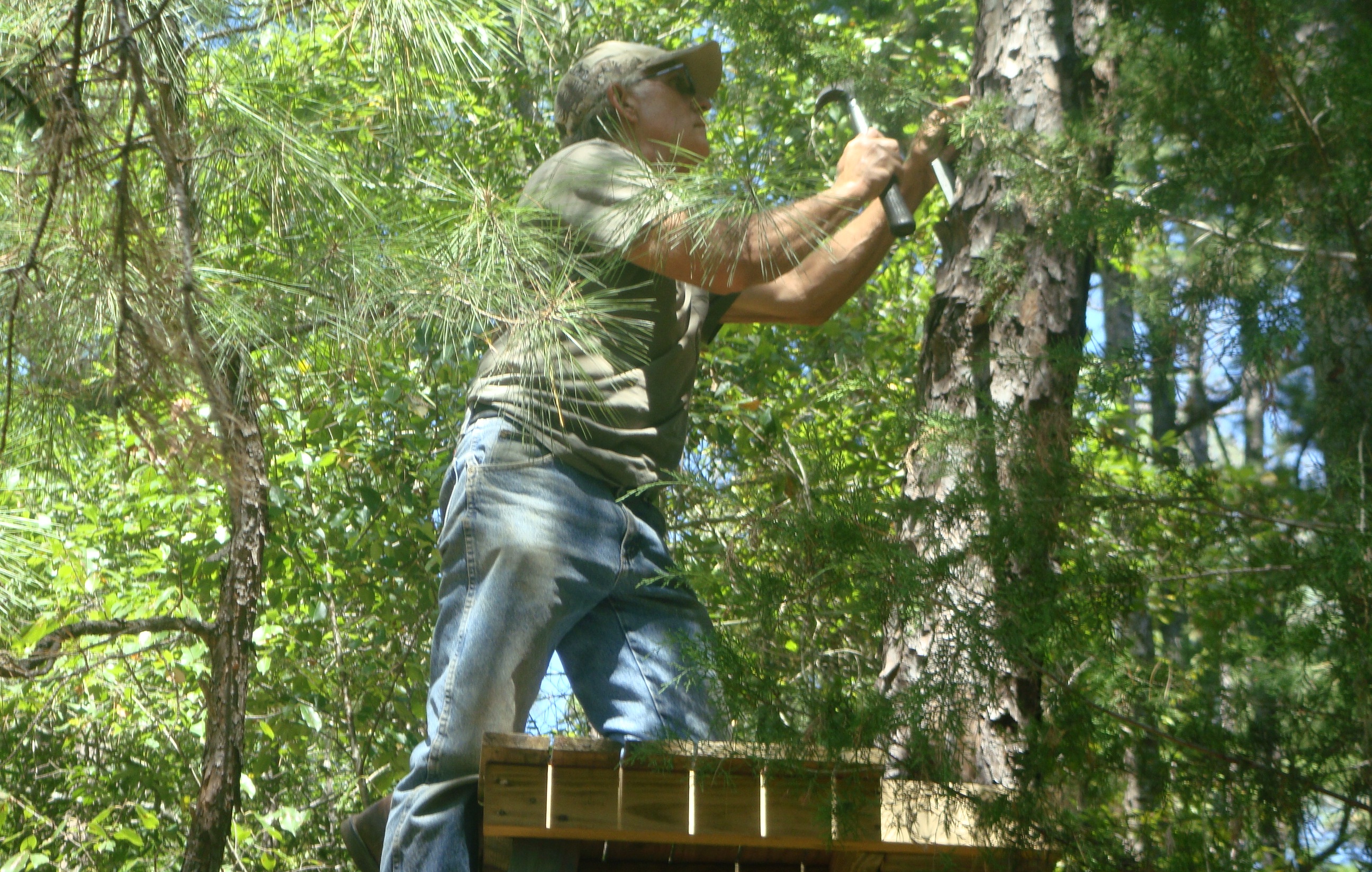 Next I drive a 16 penny finish nail into the tree to hold the top of the angle brace.