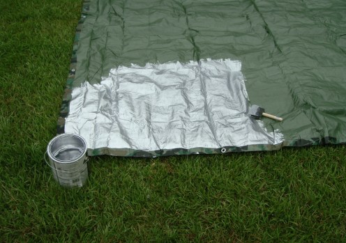 They also had quarts for about $10, but I knew that a quart wouldn’t be enough.  So, anyway, here I am standing up on a ladder painting this building when the sun comes up over the trees.  In about ten minutes I started feeling like a rotisserie chicken.  Man, I thought, this stuff really reflects some heat, and that’s when it hit me.  I wonder if I could paint this stuff onto a vinyl tarp?  Well, sure enough, I had about a half-gallon of paint left when I finished painting the building, so I decided to try a little experiment on a tarp.  I got an old tarp and painted a couple of square feet with the aluminum paint.  It flowed on smoothly and covered with one coat. It also didn’t appear to be damaging the vinyl in any way.  So far; so good.  I let it dry in the sun for a couple of hours before I gave it the durability test.  When it was dry I scraped it with my finger nails and there was no peeling.  I folded it into a crease, wadded it up, and just generally tried to make the paint crack or peal.  The tarp seemed to be completely flexible, and the paint adhered beautifully.  I thought to myself, “We may have a winner.”