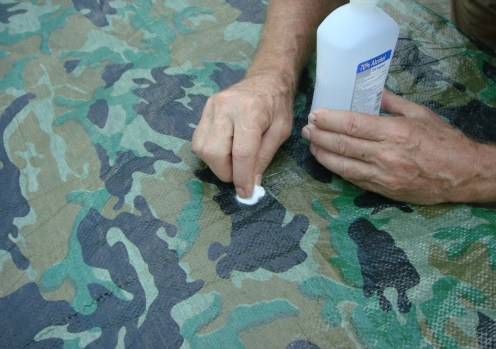 Dampen the cotton ball with rubbing alcohol and clean the surface of the tarp and the loop tabs. Let them dry for a few minutes.