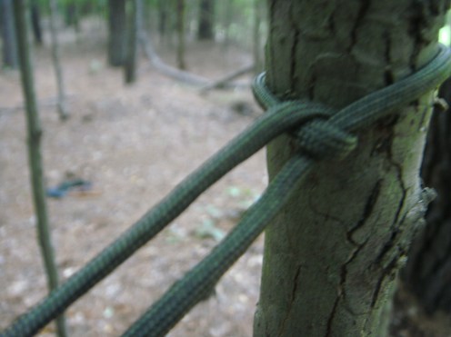 Pull the other end of the guy line back to the back tree and wrap it around the tree a couple of feet higher than your bungee cord is attached to the front tree.  Tie the guy line off using the simple quick release knot pictured below.  Notice that the small stick is inserted into the finished loop to prevent accidentally untying the knot.