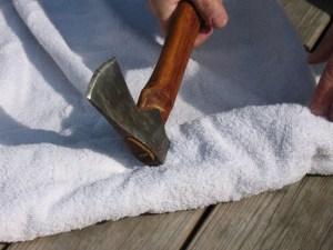 When you’ve selected a good bottle and warmed it up, it’s time to start breaking glass. Before you bust into the bottle you need to take some safety precautions. You should always wear safety glasses, not just regular glasses, but real safety glasses. Those little shards of glass fly like shrapnel, and an eyeball won’t slow them down much, so wear your safety glasses. If you do a lot of knapping it’s probably a good idea to wear a dust mask over your mouth and nose. Every time you knock a flake off, you’re sending loads of nearly microscopic glass particles into the air. Breathing this glass dust into your lungs can cause really bad things to happen, just like breathing asbestos dust. So, now that you’re all geared up, let’s break some glass. Take your bottle and wrap it up in an old towel, lay it on a hard surface, and gently wack the side of the bottle with a hammer. Try not to smash the bottle, or you’ll end up with pieces that are too small to use. I usually hit the upper shoulder of the bottle because I’m trying to keep the bottom in one piece. Pictured below: Breaking a bottle.