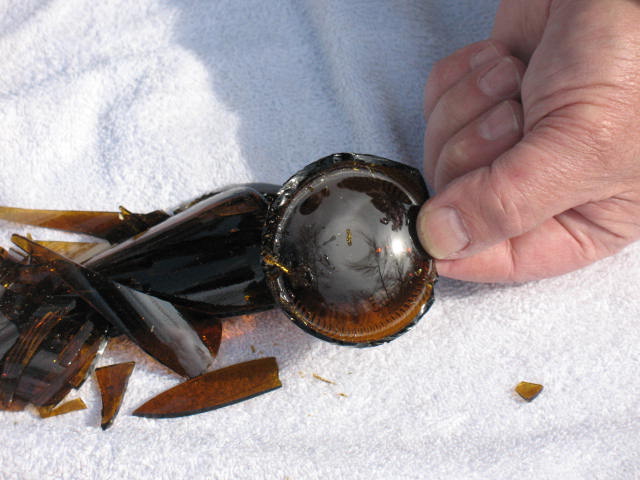 After you hear that satisfying crunch, unwrap the towel and see what you’ve got. With any luck the bottom will still be in one piece with a few jagged points of glass sticking up. If you weren’t so lucky, no big deal, it’s just an old bottle. Grab another one and try again. Pictured below: Bottom of bottle. This is what you are looking for to make your arrowhead out of.