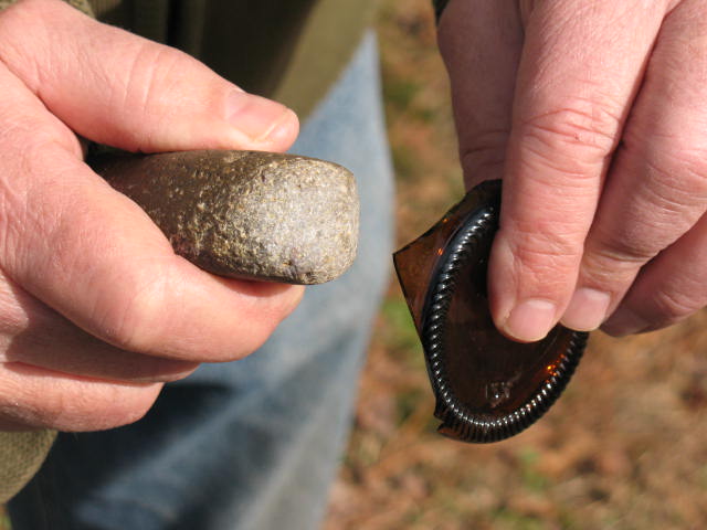 When you have the side glass removed, it is time to start knocking the bottom into shape. Just strike glancing blows to the edge of the glass. Don’t try to take off too much at one time. After you have knocked a series of flakes from one side of the glass, turn the glass over and knock flakes from the other side. Work your glass down into a triangle that is somewhat bigger than you want your finished point to be. Picture below: Percussion flaking the bottle bottom into a rough shape from which you can flake the finished point.