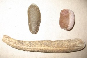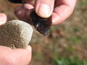 Now it’s time to do a little percussion flaking. Percussion flaking is where you use a rock or an antler billet to knock flakes off of the edge of your glass. Percussion flaking is not going to be pretty; it’s just how you’re going to rough out the shape of your point. Pictured below: Percussion flaking tools.
