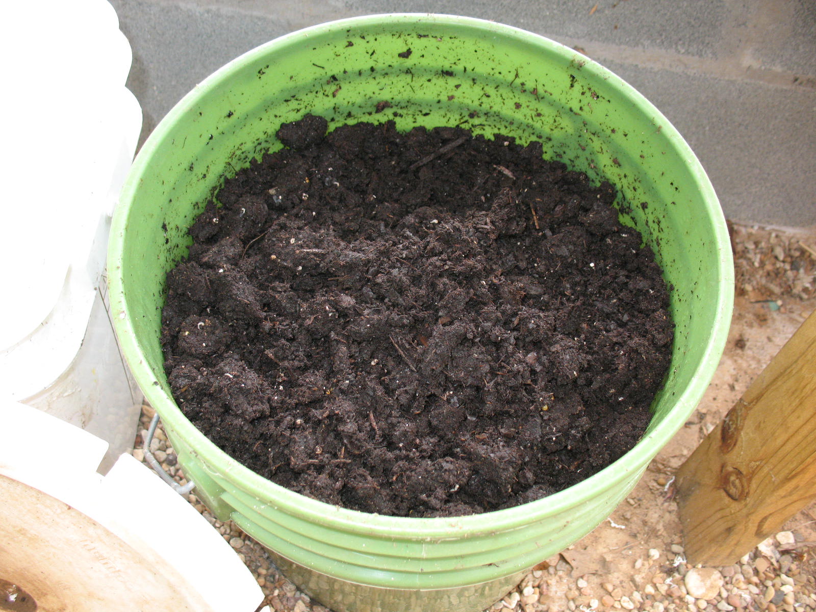 You can make your own potting soil but I usually buy mine. A thirty pound bag of potting soil will last me three or four years and the cost is negligible, just make sure that you buy good quality potting soil. Cheap potting soil will be full of uncomposted bark and sticks the size of firewood. I buy Miracle Grow potting soil which is pretty fine and seems to work well. As soon as I open a bag of potting soil, I transfer the contents to a lidded five-gallon bucket. This keeps the potting soil from drying out and it is easier to use than digging around in a semi-torn up plastic bag.