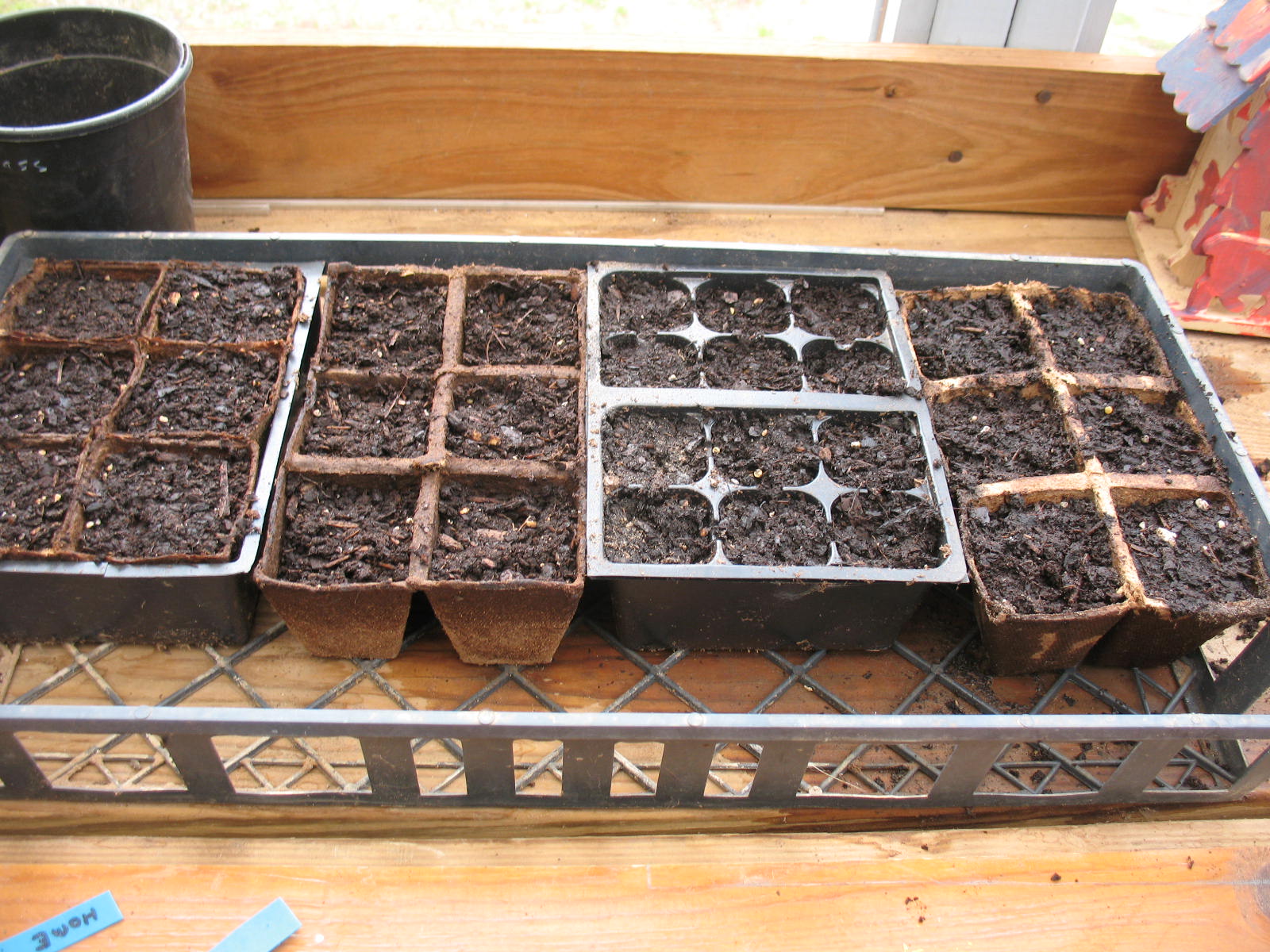 As soon as you have a set of pots planted, put a small marker in one of the pots to show what you planted. I use little plastic markers that I cut from an old loose-leaf binder and write the name on it with permanent marker so that it won’t wash off when I water. Don’t skip this step. You will forget what you have planted. Again, I speak from experience on this.