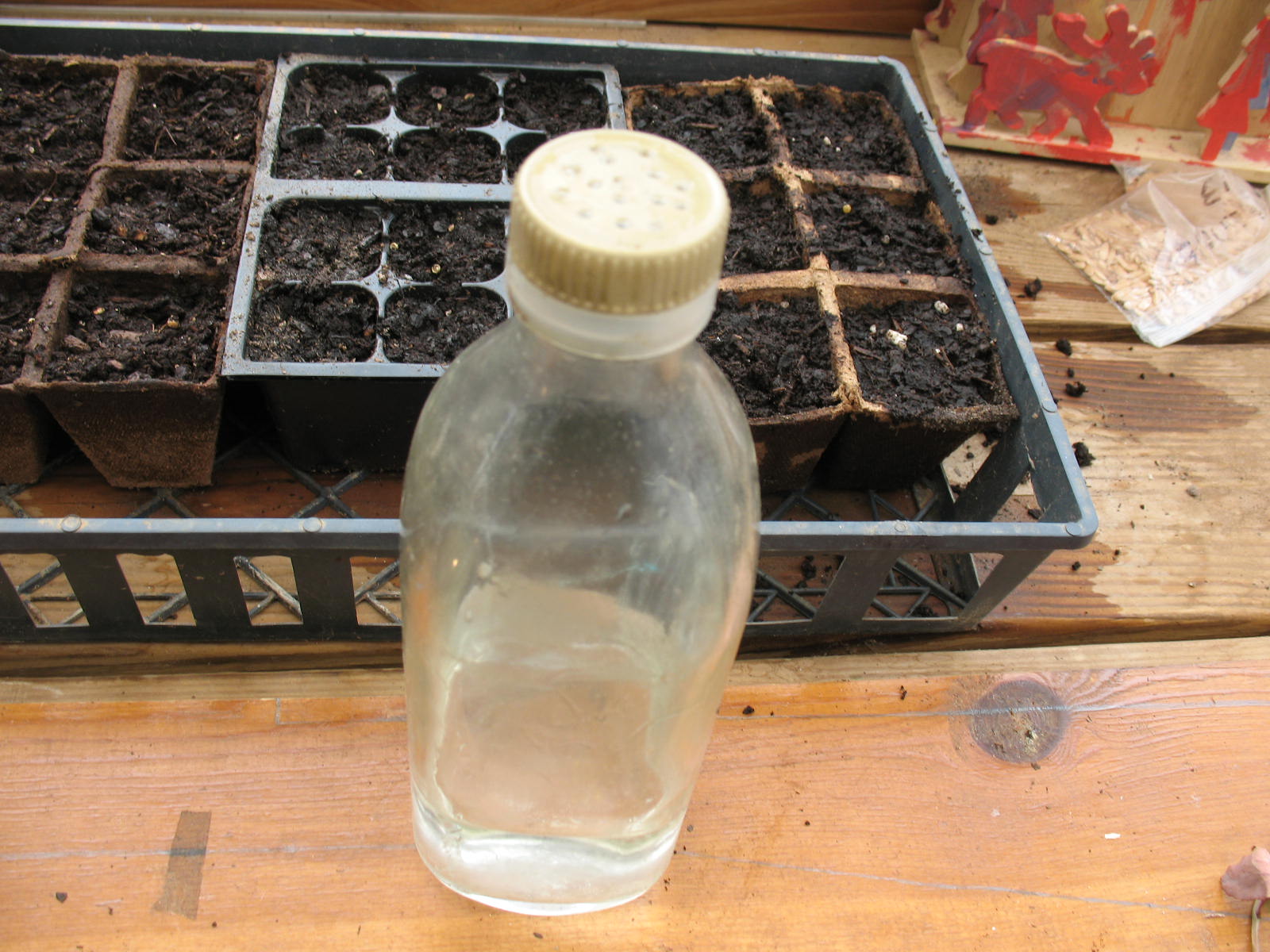 When your pots are all full, water them gently but thoroughly and allow to sit over night. I use an old vegetable oil bottle with holes punched in the top for watering. This tends to trickle the water onto the soil so that you don’t wash your seeds up after you’ve planted them.