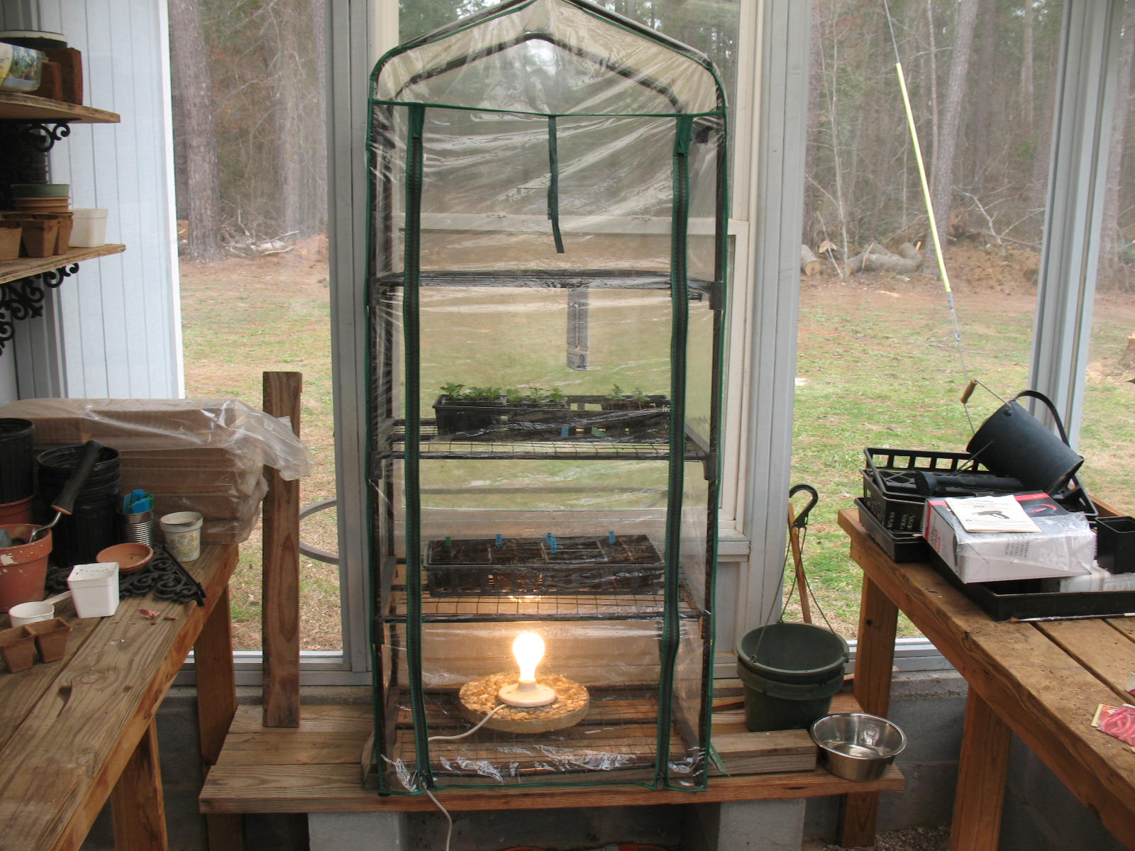 I have an attached greenhouse but I never heat the whole greenhouse. Instead I use a small germinating tent inside of the greenhouse that I can heat at night with one light bulb. The tent consists of a metal framework with four shelves and a clear plastic tent that slips over the framework. It has a zipper front for easy access. I bought it on Amazon for thirty-five or forty dollars. One light bulb will keep it from freezing even when the outside temperatures are in the upper twenties. Colder than that and I bring the plants inside.