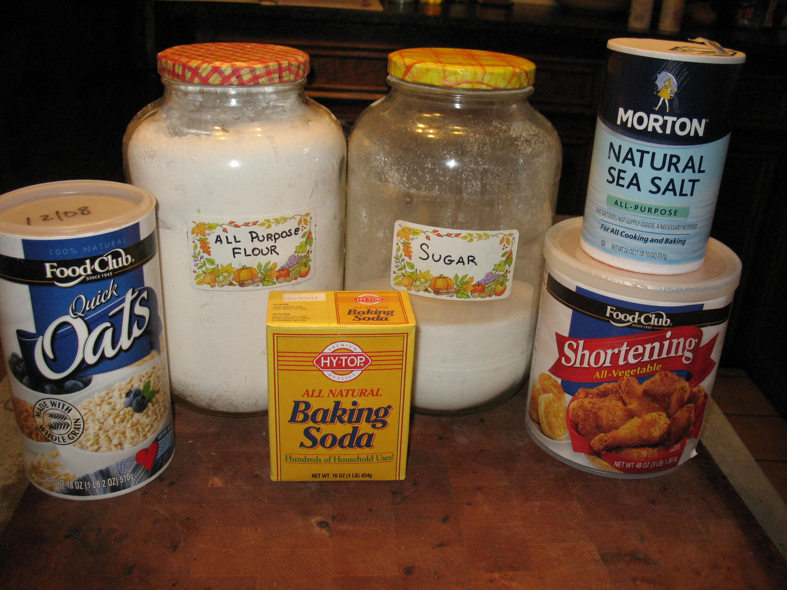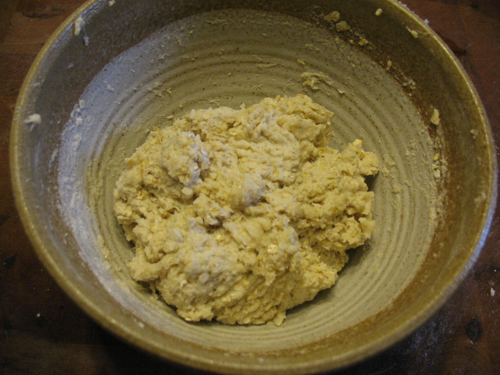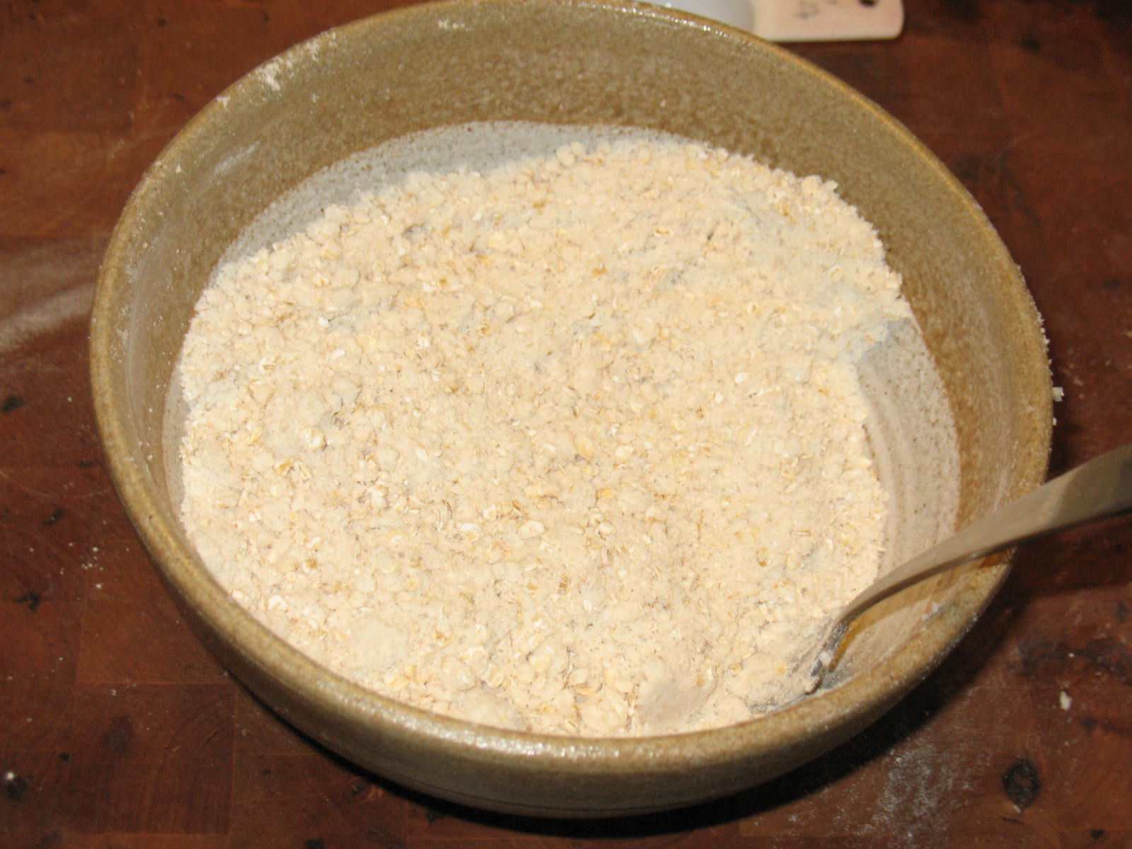 In a mixing bowl combine the flour, oats, salt baking soda, and sugar and mix thoroughly