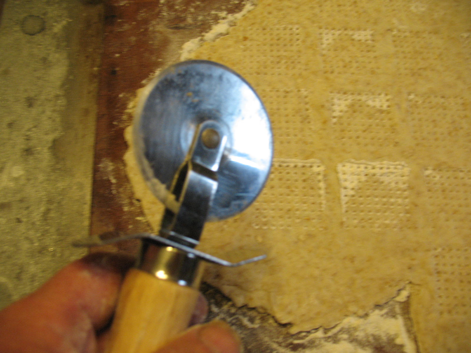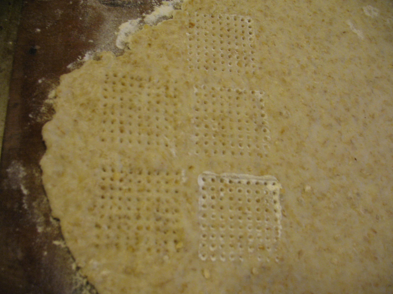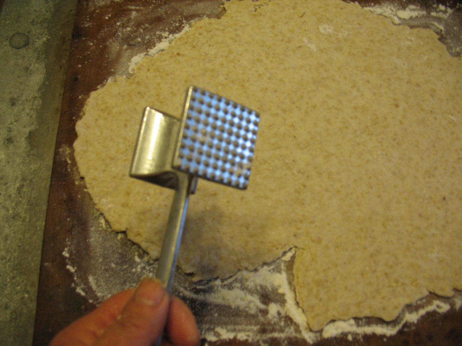 Use the bumpy side of a meat tenderizing mallet to press indentions into the dough. If you dip the head of the mallet into flour after every third of fourth use, it will keep the head of the mallet from sticking to the dough. If you don’t have a mallet, use a fork to poke indentions into the dough. These aren’t just for looks. They help the cracker cook evenly inside and out.