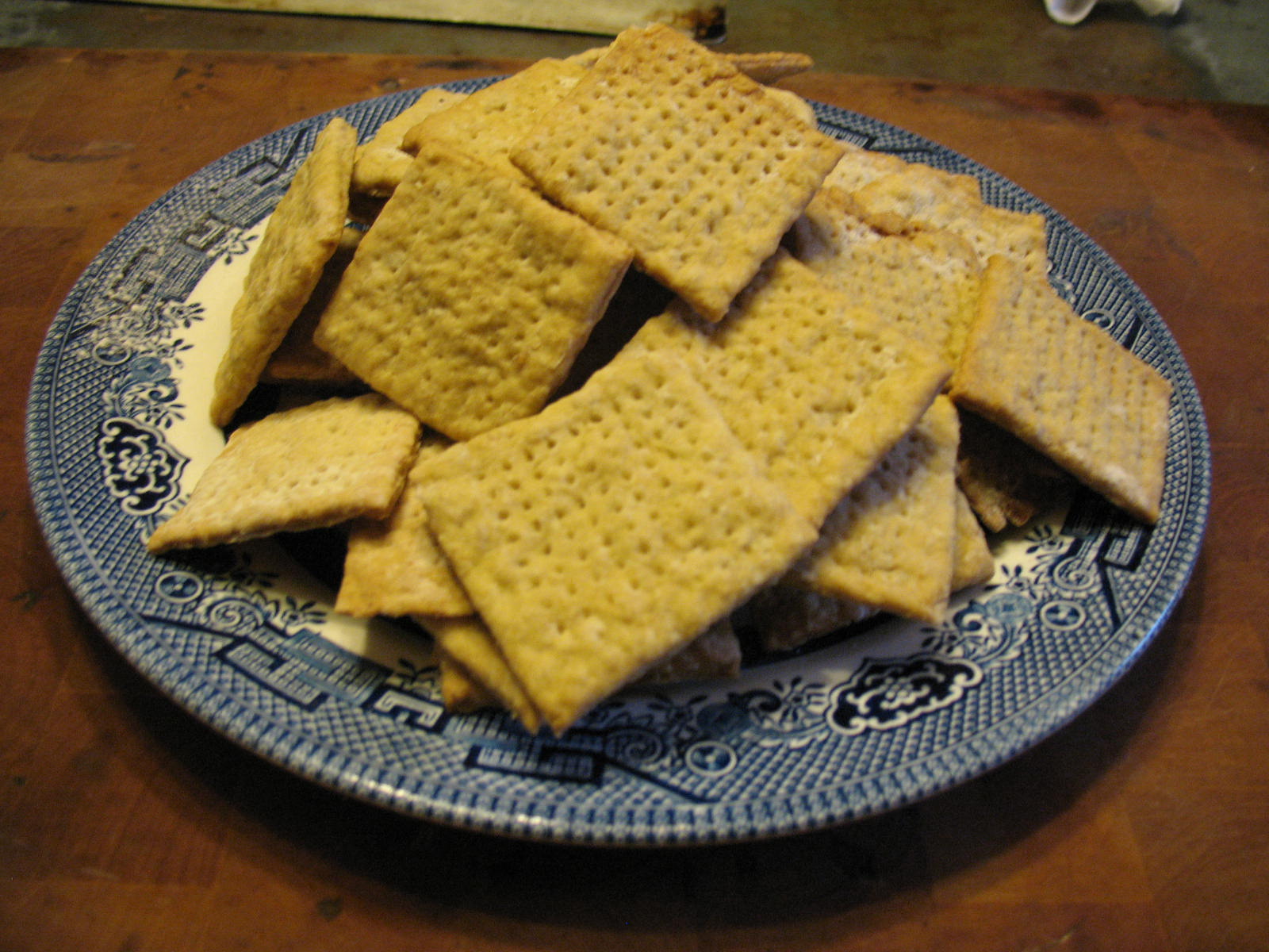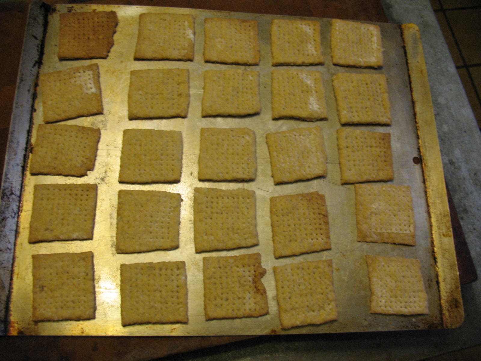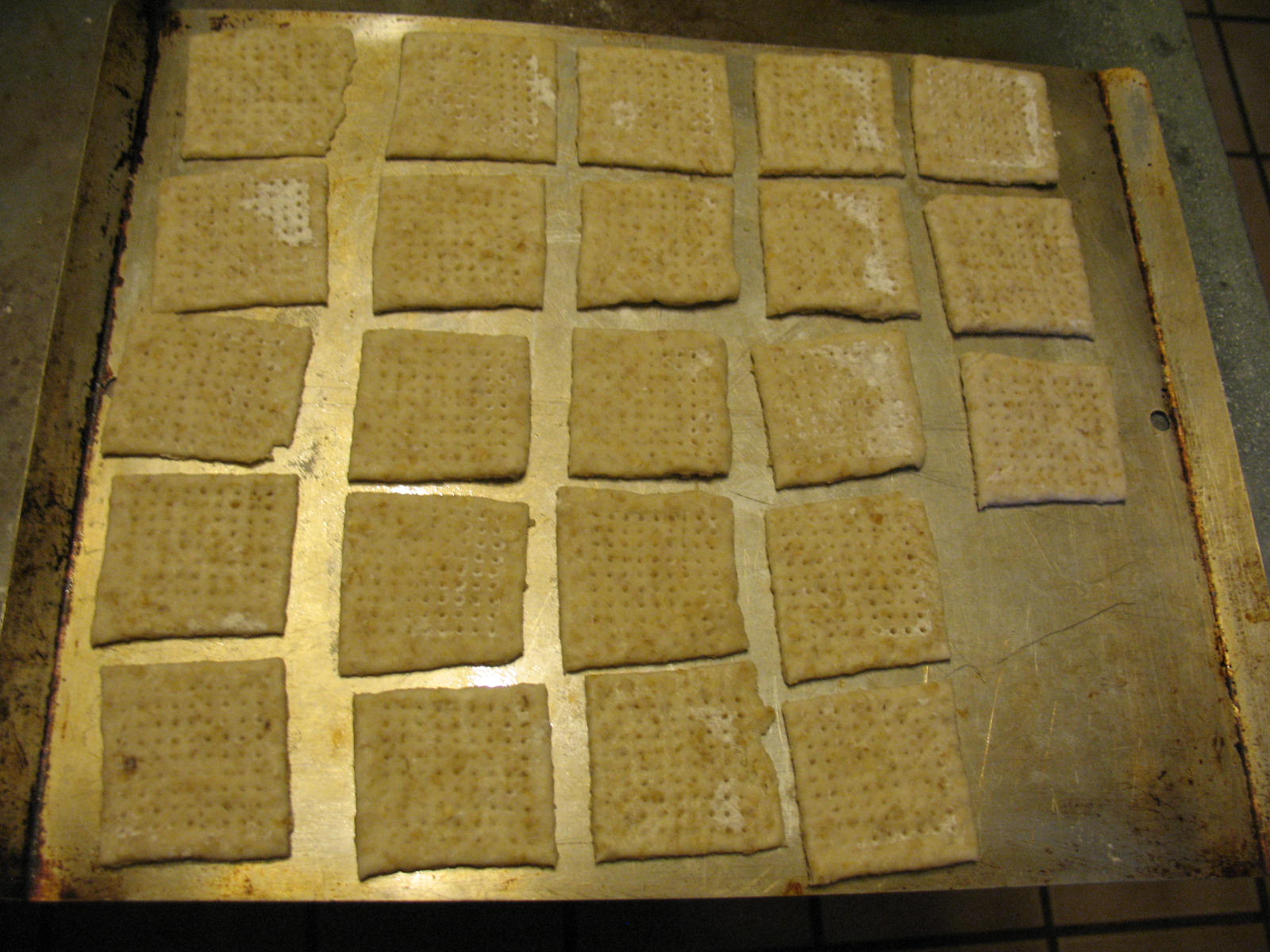 Place the squares of dough on a lightly greased baking sheet and bake at 375 degrees F. until the crackers are golden brown. On my old stove this is 18 minutes, but I’d start checking at 15 minutes if I were you. Meanwhile you can roll out and prepare the other ball of dough for baking.