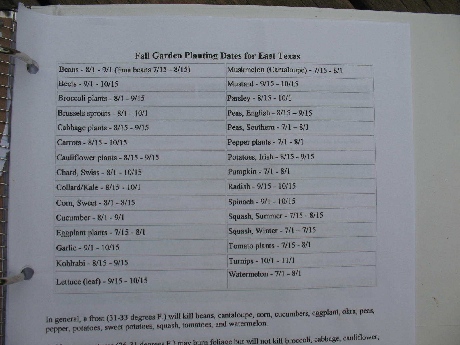 In one of the inside pockets I keep my planting guides. I have three of them. One is from the agricultural extension service, one is from the local garden club, and one is from a local feed store. You would be surprised at how much variation there is in planting dates. I actually took the information from all of them and then made up my own chart where I tried to hit the sweet spot by averaging the dates on the three others.