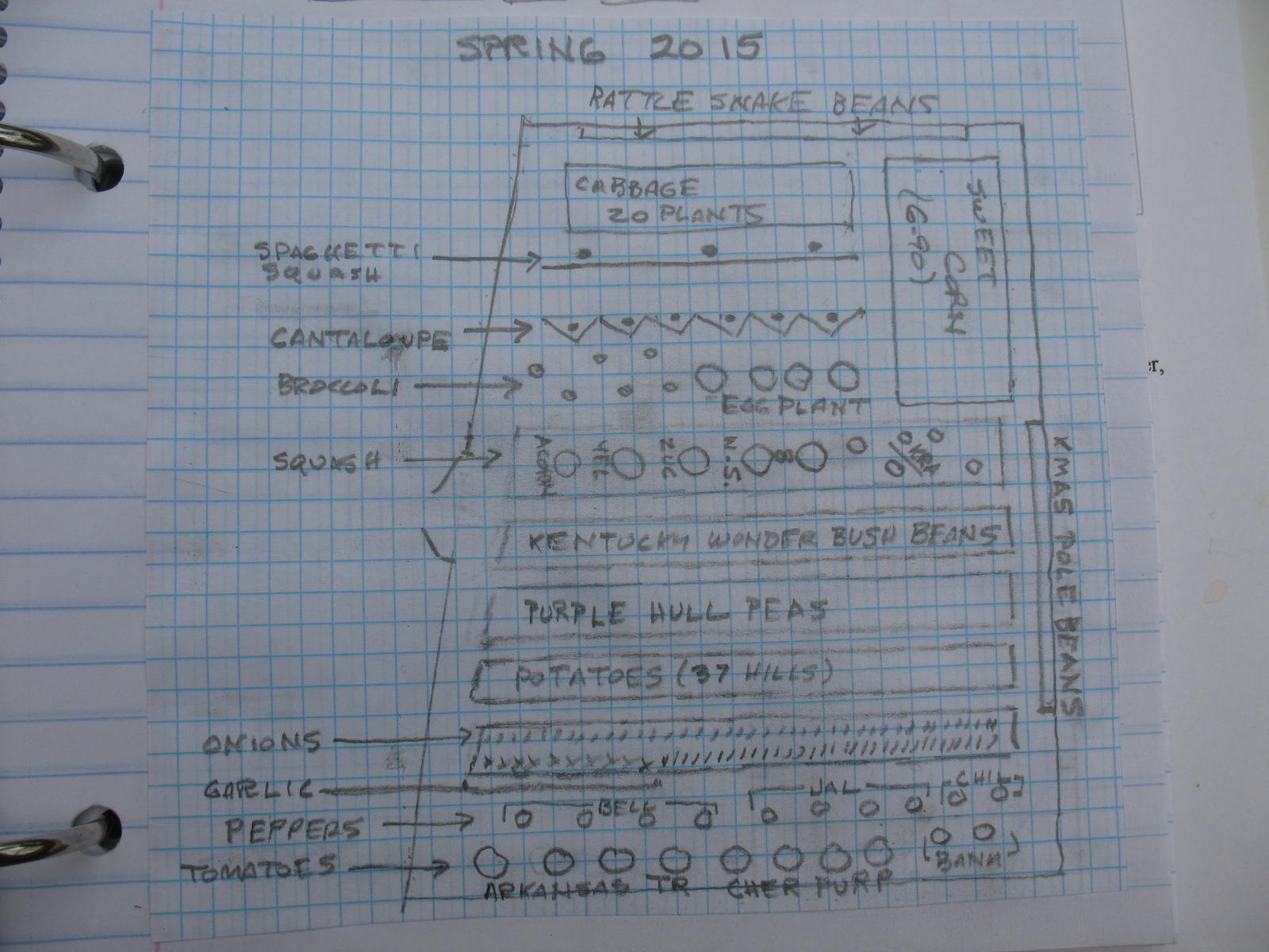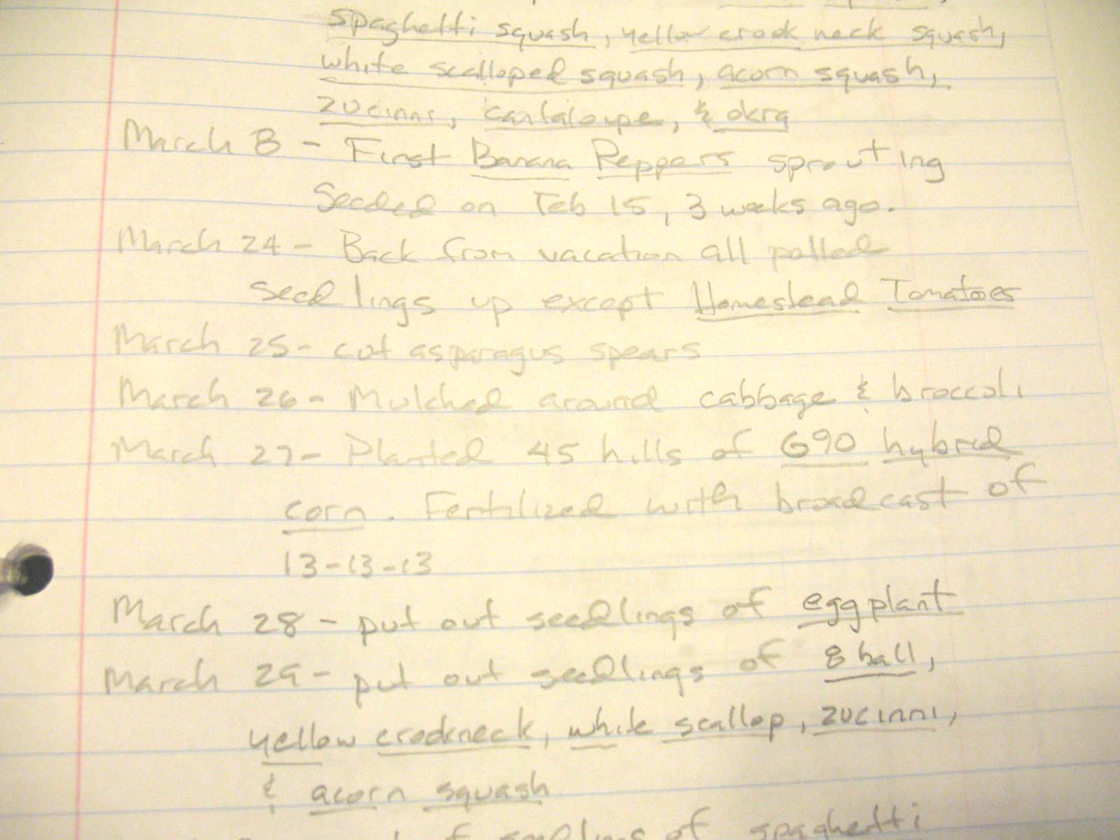 In the spiral notebook I keep a day to day record of what varieties I have planted, when I planted them, when they sprouted, etc. I also include a scale drawing of my garden and where everything is planted. This helps me rotate crops, and plan my companion planting. I will update the garden diagram in mid-summer and fall as I replant.