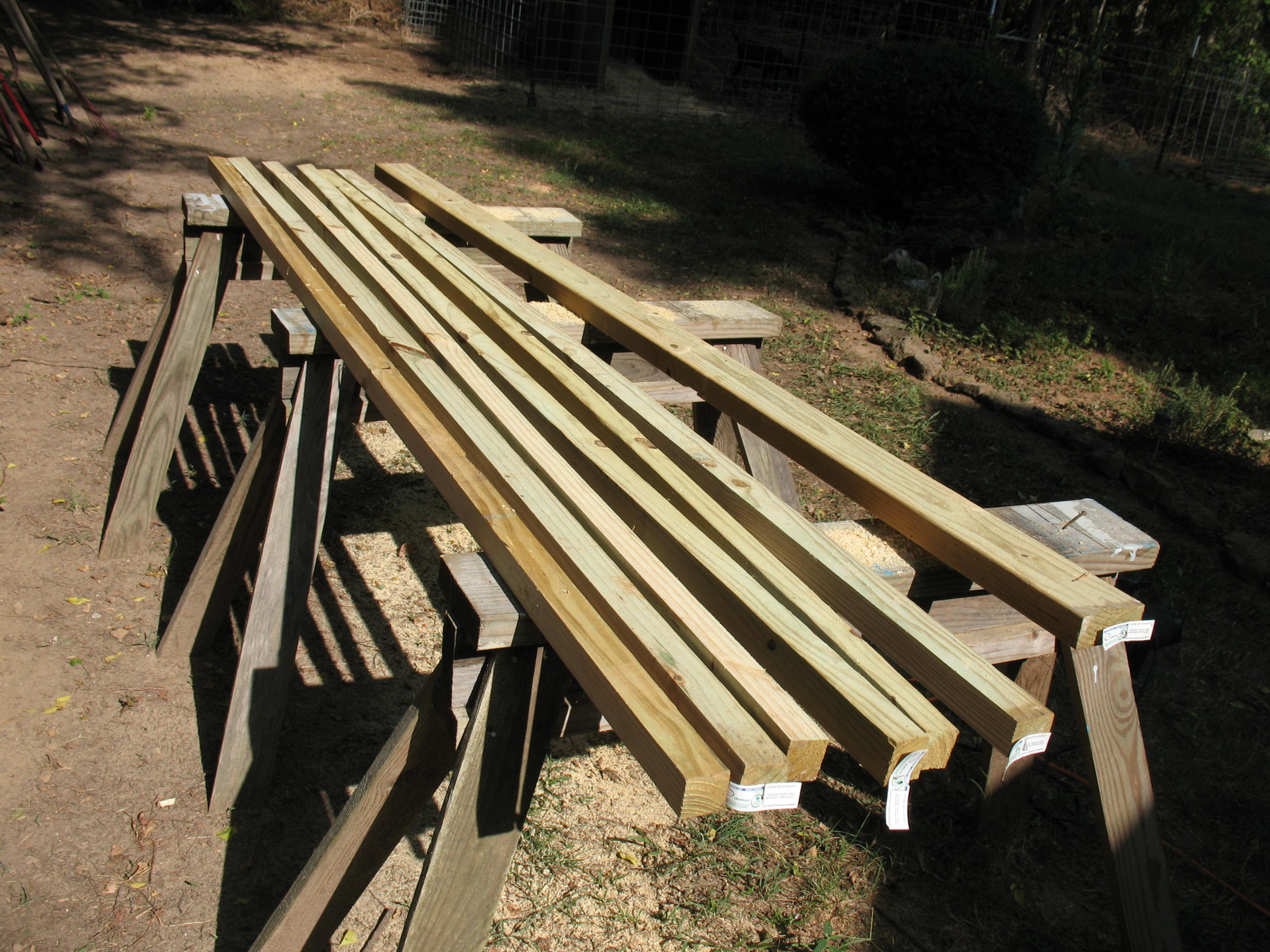 First I took my newly purchased 2 X 4’s along with a couple of recycled ones and ripped them in half so that the finished lumber was 1 ½” by 1 ¾” by eight feet long.