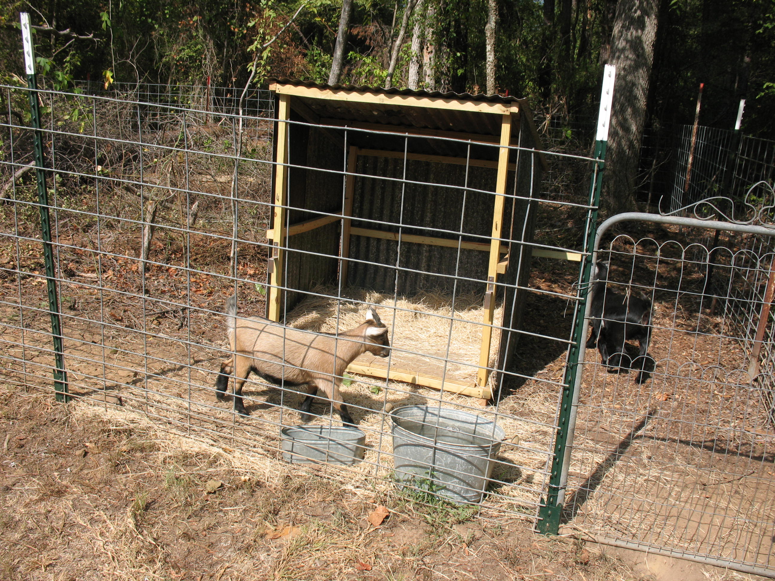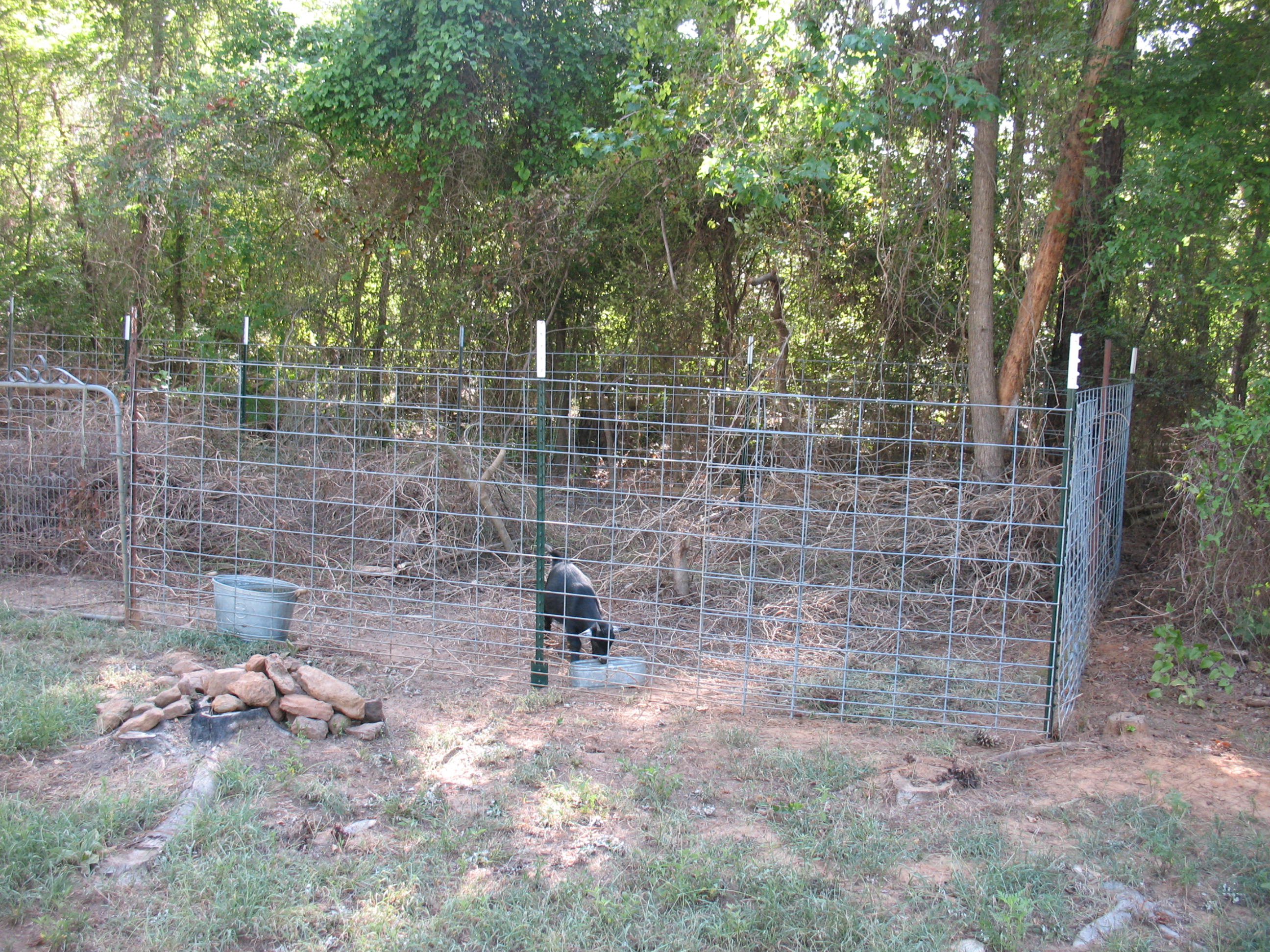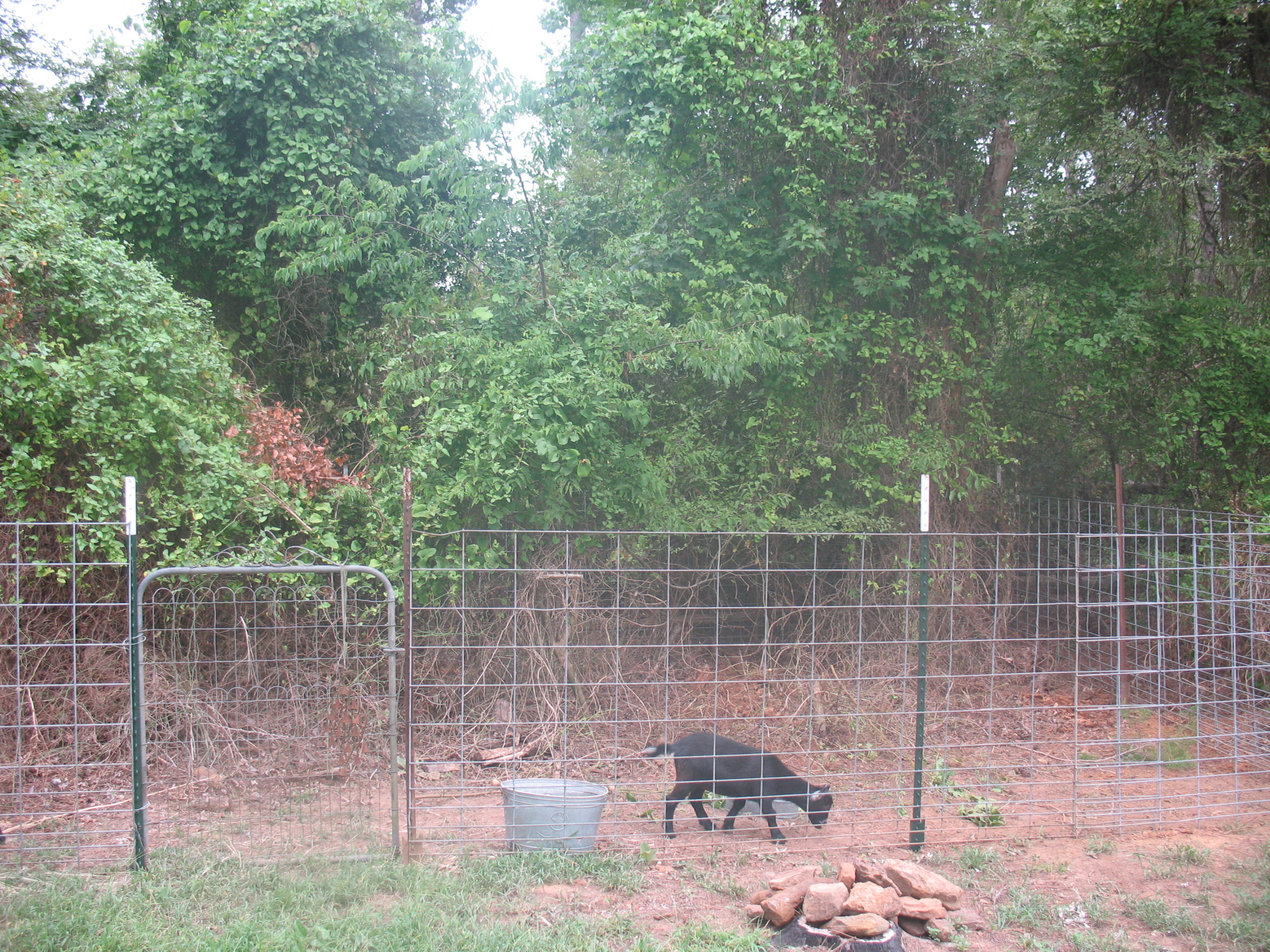 Of course I needed to control the area that they clear so I built them a movable pen out of T-posts and cattle panels. The panels are 16 feet long, so I put in T-posts 8 feet apart and wired the panels to them using tie wire like you would use to tie re-bar together. I didn’t drive the T-posts very deep because I will have to pull them up on a regular basis. I made the pen about 16 by 32 feet. I’ve heard that goats are hard to fence in, but I’ve had no problems with them trying to get out. Of course they are nannies, so they are not as aggressive as a billy-goat would be.